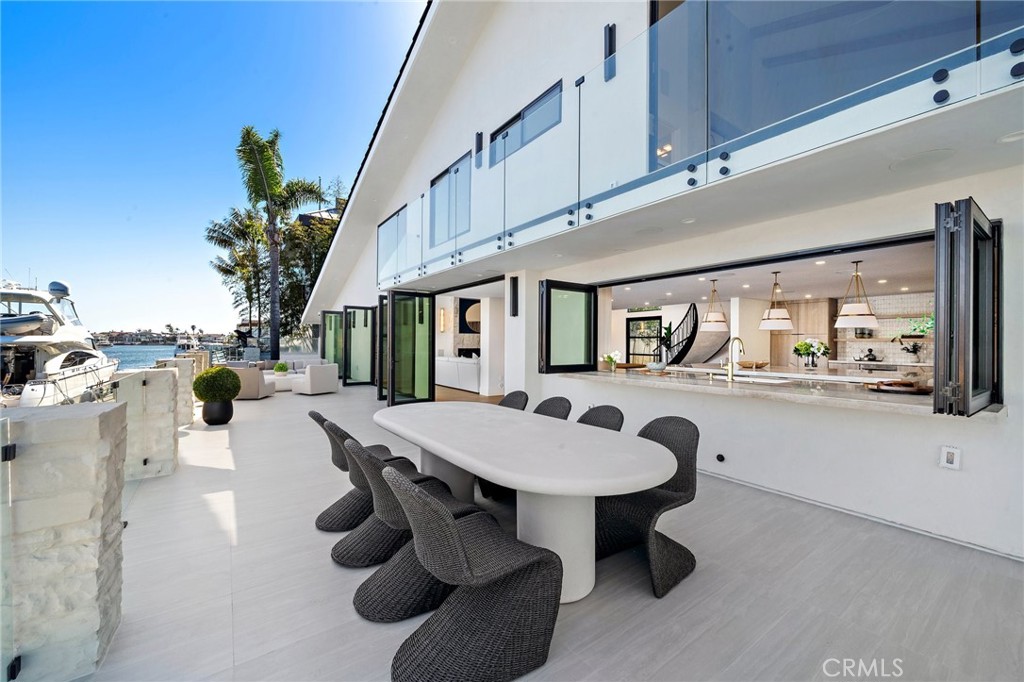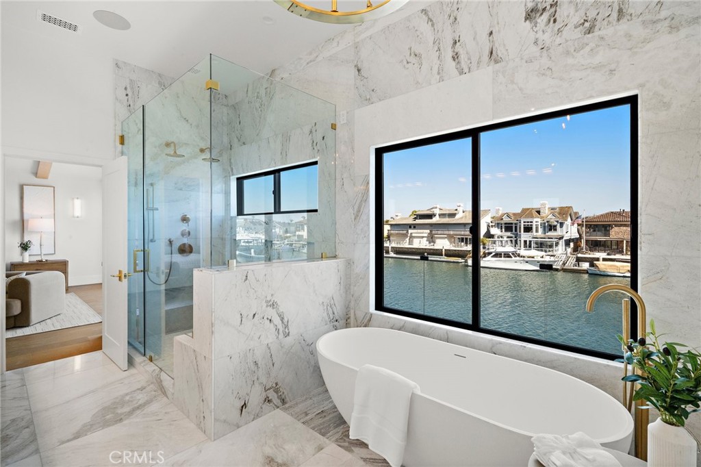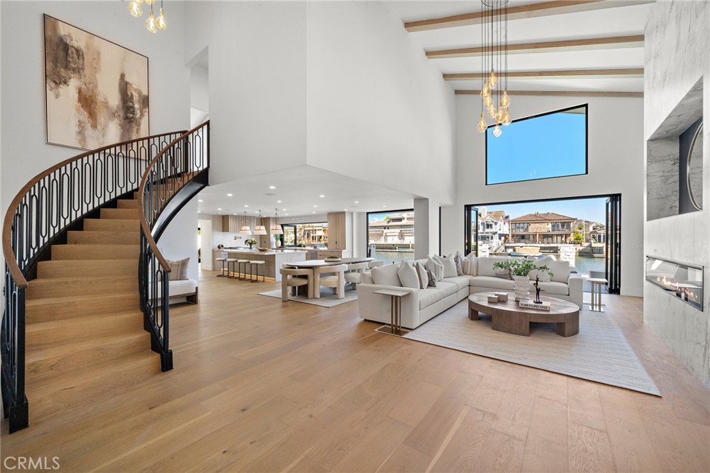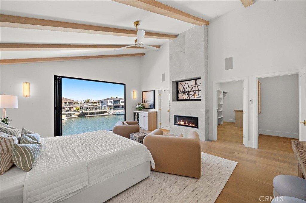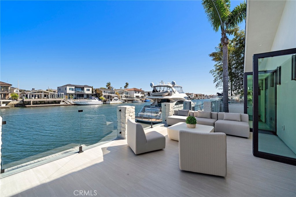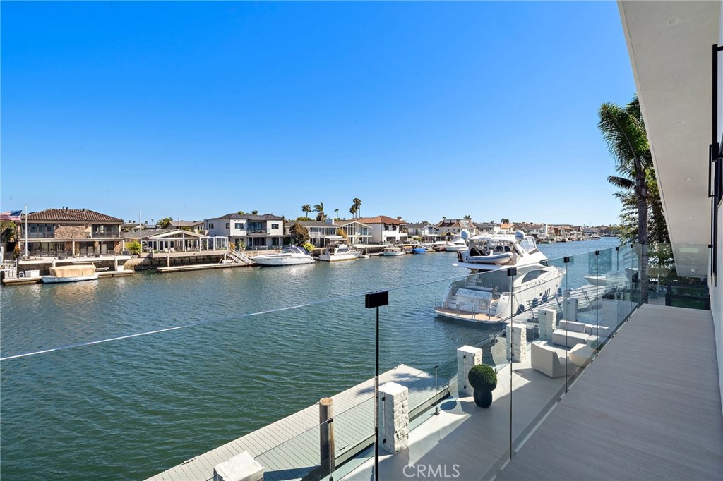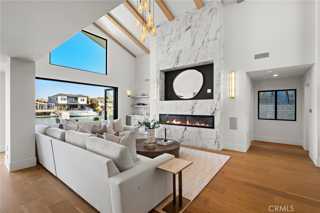 Exceptional custom-built waterfront residence with 110 feet of prime waterfrontage on the Midway Channel of Huntington Harbour. Located on prestigious Humboldt Island the property features stunning wide water views and a private 73-foot side tie boat dock. This crisp contemporary property was taken down to the studs and has been fully remodeled and renovated. Every aspect of the property has been thoughtfully and meticulously designed for the ultimate in California Coastal Waterfront living. As you enter though the tranquil courtyard you are greeted by the massive pivot door that leads you into the gracious living space. High volume beamed ceilings open up to your waterfront paradise. The grand fireplace graces the living room with elegance and style. Bonelli Italian folding doors encompass the entire back side of the property leading out to the abundant waterside deck. Rich white oak wood flooring flows seamlessly throughout the interior of the home. The kitchen is a dream come true! Sleek Taj Mahal quartzite counters and custom-built flat panel European cabinetry. Ilve Nostalgie II restaurant grade stove is sure to please the chef in the house. Gorgeous marble backsplash and an expansive center island for all your gatherings. Bonelli bi folding windows open up over the kitchen sink and out to the bar area on the exterior of the home. There is a very spacious downstairs bedroom with adjacent bath that could easily be a second primary suite. Downstairs office has a point location water view of the Harbour and can also serve as an entertainment hub for the patio area. As you ascend the grand staircase you are led to the fabulous primary suite. A true sanctuary with high volume beamed ceilings and a private balcony. Built in beverage station and an inviting fireplace flatter the balance of the space. The primary bath is a showstopper with lux white floor to ceiling marble. Vast shower with multi-function shower heads and a sumptuous soaking tub with views out to the Harbour. Custom flat panel European floating cabinetry and a vanity area that spans the entire length of the room. Two additional upstairs bedroom's both with high volume ceilings and architectural window placement. The deck on the rear grounds of the property wraps around the entire 110 feet of the lot. Endless opportunities for relaxing and entertaining are found here with views of the sparkling waters of Huntington Harbour. Come enjoy the Harbour lifestyle and all of life's true luxuries!